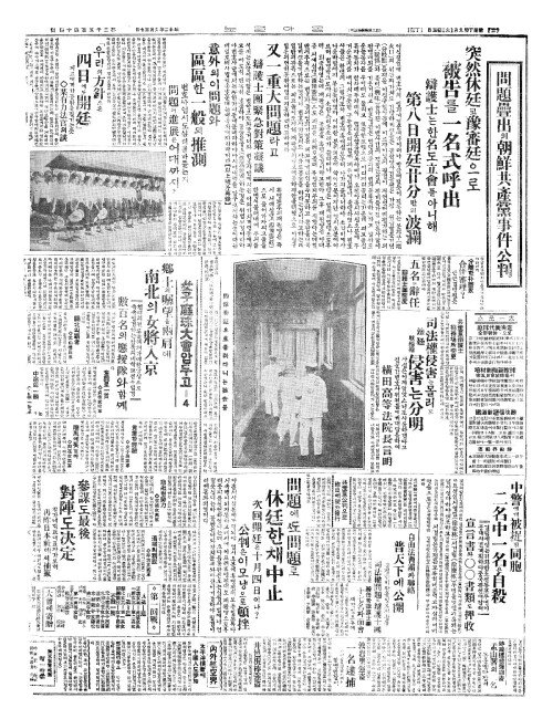 - 問題疊出(문제첩출)의朝鮮共產黨事件公判(조선공산당사건공판) 突然休廷(돌연휴정)코豫審廷(예심정)으로 被吿(피고)를一名式呼出(일명식호출)