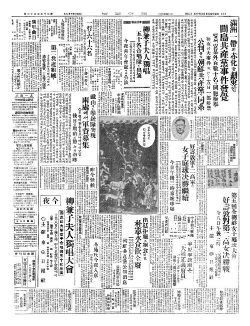 - 本社主催(본사주최) 柳兼子夫人獨唱(류겸자부인독창) 五十名合唱隊(오십명합창대)도出演(출연) 본사주최류겸자부인의독창대회 금팔일밤에종로청년회관서공연 今夜靑年會舘(금야청년회관)에서公演(공연)