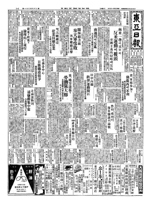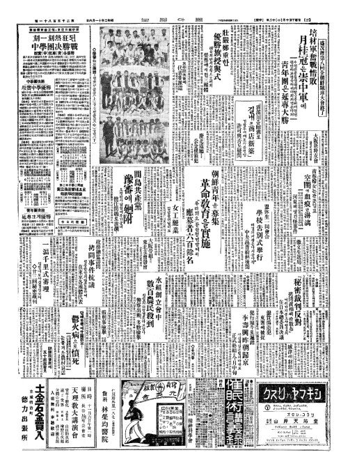 - 朝鮮體育會主催(조선체육회주최)·東亞日報後援(동아일보후원) 刻一刻(각일각)?????狂(광)된 中學團决勝戰(중학단결승전)