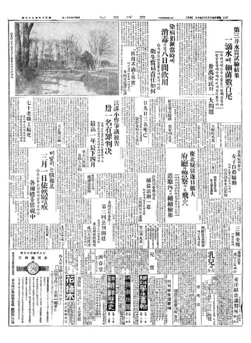 - 第三井水質試驗結果(제삼정수질시험결과) 一滴水(일적수)에細菌數百尾(세균수백미)
