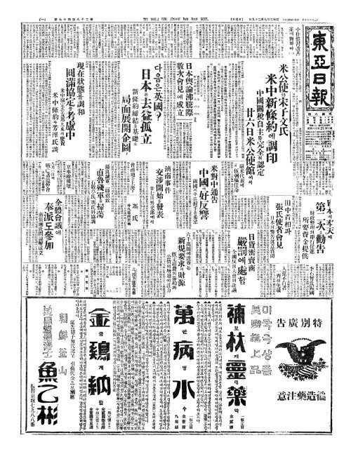 - 米公使(미공사)와 宋子文氏(송자문씨) 米中新條約(미중신조약)에 調印(조인)