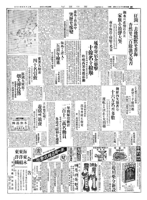 - 狂瀾一去後默默(광난일거후묵묵)한蒼海(창해) 杳然(묘연)한三百餘漁父安否(삼백여어부안부)