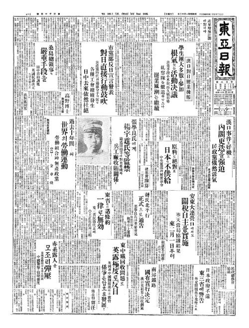 - 漢口對日罷業後報(한구대일파업후보) 學生團大多數(학생단대다삭)도參加(삼가) 根氣(근기)잇는活動决議(활동결의)