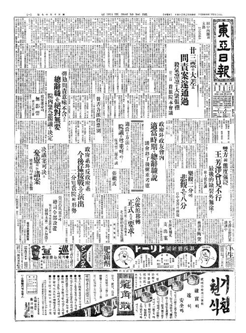 - 廿三票(입삼표)의大差(대차)로 問責案遂通過(문책안수통과)