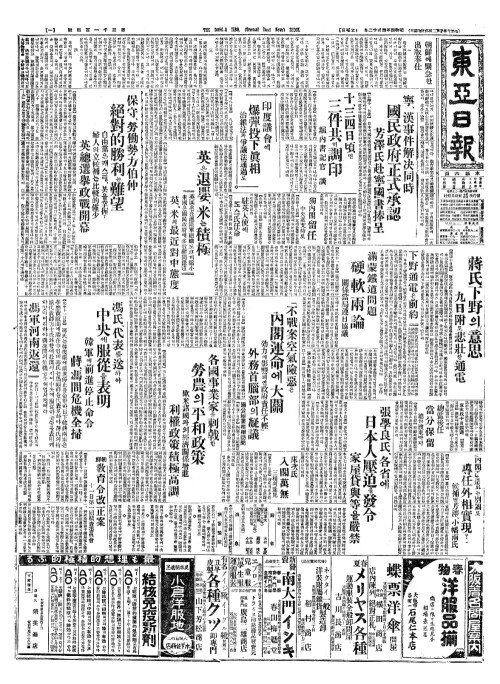 - 蔣氏下野(장씨하야)의意思(의사) 九日附(구일부)로悲壯(비장)한通電(통전)