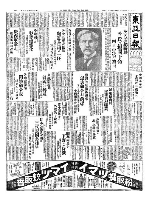 - 英內閣總辭職(영내각총사직) 막氏(씨)에組閣下命(조각하명) 四日中决行(사일중결행)될터