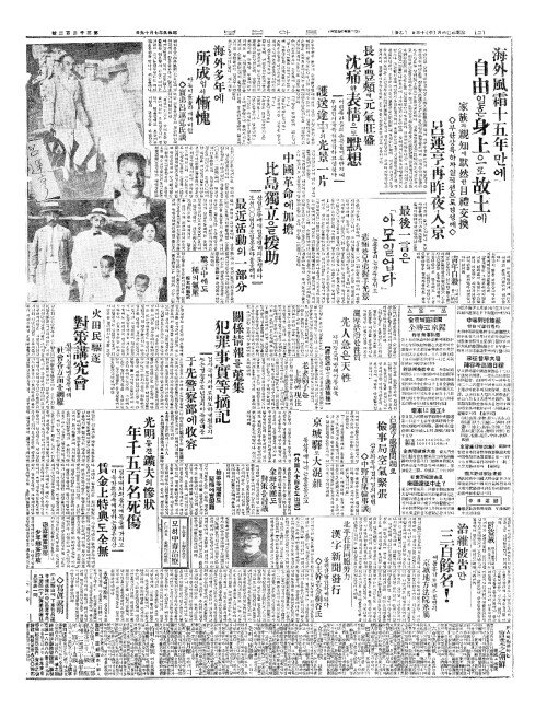 - 海外風霜十五年(해외풍상십오년)만에 自由(자유)일흔身上(신상)으로故土(고토)에