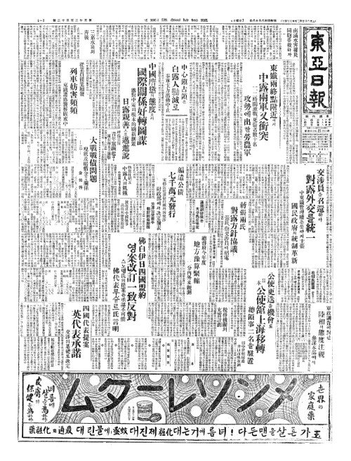 - 物貨杜絕(물화두절)로 中露人(중노인)의饑餓(기아) 外蒙奧地千五百名(외몽오지천오백명)