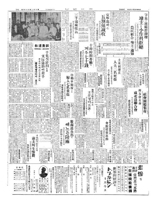 - 旱災(한재)로流離群激增(류리군격증) 地主(지주)에게小作料拒絕(소작요거절)