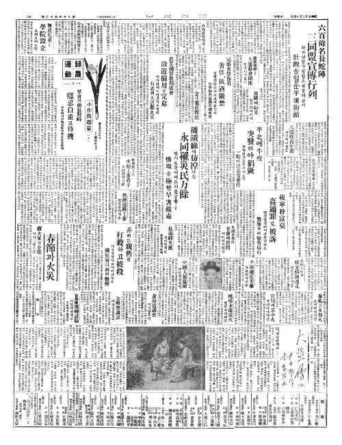 - 六百餘名長蛇陣(륙백여명장사진) 三同盟宣傳行列(삼동맹선전행렬)