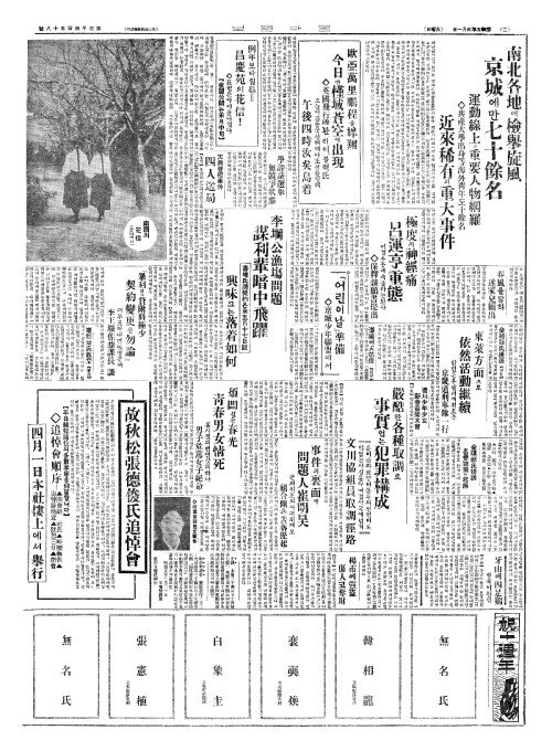 - 南北各地(남배각지)에檢擧旋風(검거선풍) 京城(경성)에만七十餘名(칠십여명)