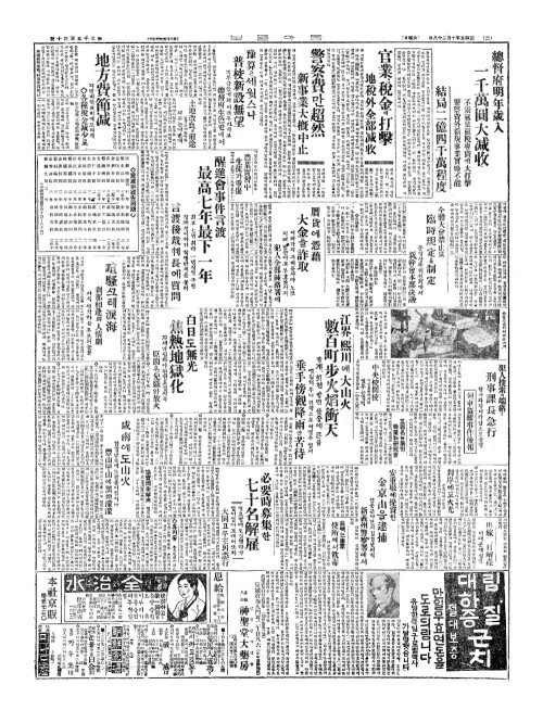 - 總督府明年歲入(총독부명년세입) 一千萬圓大减收(일천만원대감수)