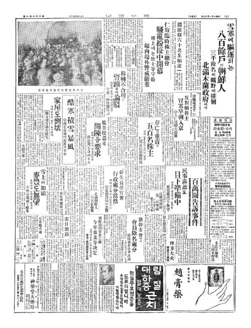 - 雪寒(설한)에驅逐(구축)되는 八百餘戶(팔백여호)의朝鮮人(조선인)