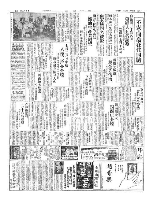 - 不安(부안)한間島在住同胞(간도재주동포) 自衛團三十餘名(자위단삼십여명)이 朝鮮人五名銃殺(조선인오명총살)