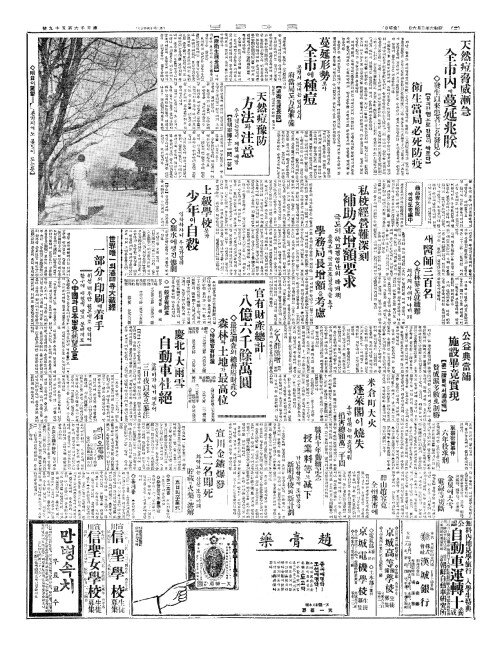 - 天然痘脅威漸急(천연두협위점급) 全市內(전시내)에 蔓延兆朕(만연조짐)