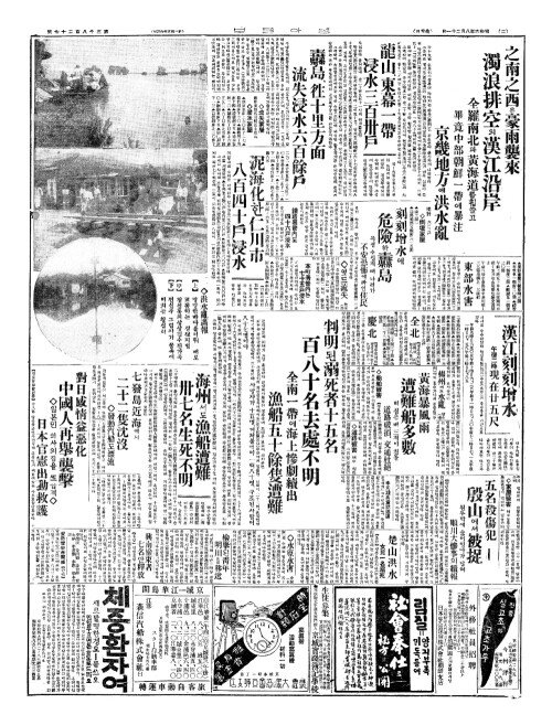 - 龍山(룡산)、東幕一帶(동막일대) 浸水三百卅戶(침수삼백삽호)