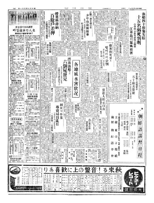 - 漁船四十餘隻失踪(어선사십여척실종) 十五名溺死判明(십오명닉사판명)