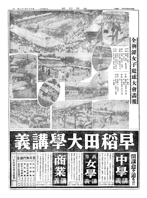 - 本社主催(본사주최)·㐧九回全朝鮮女子庭球大會(제구회전조선여자정구대회) 銀線上(은선상)에蓮步生風(련보생풍) 光輝(광휘)잇는大竸技開幕(대경기개막) 朝鮮(조선)의딸들의 깃븐이날!