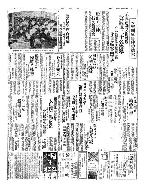 - 永興(영흥)데모事件益擴大(사건익확대) 示威運動又復發覺(시위운동우복발각) 放銃(방총)코二十名檢擧(이십명검거)