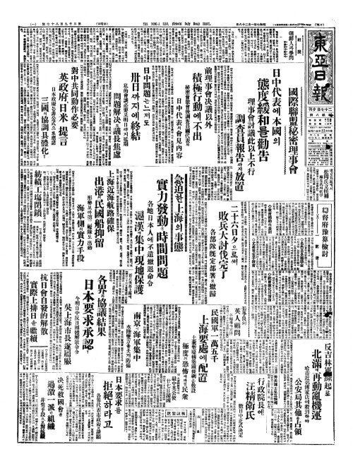 - 國際聯盟秘密理事會(국제련맹비밀이사회) 日中代表(일중대표)에本國(본국)의 態度緩和(태도완화)를勸吿(권고)