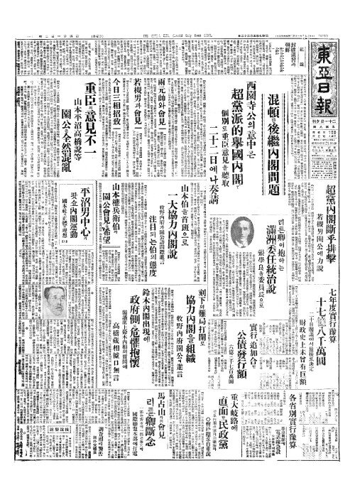 - 山本伯(산본백)을首班(수반)으로 一大協力內閣說(일대협력내각설)