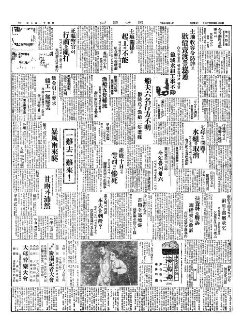 - 東海岸一帶暴風(동해안일대폭풍) 漁船廿二隻遭難(어선입이척조난)