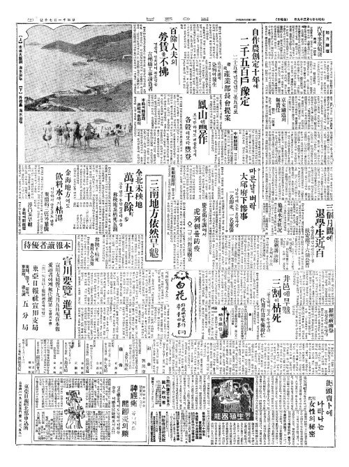 - 三南地方依然旱魃(삼남지방의연한발) 全北未秧地(전북미앙지) 萬五千餘町步(만오천여정보)