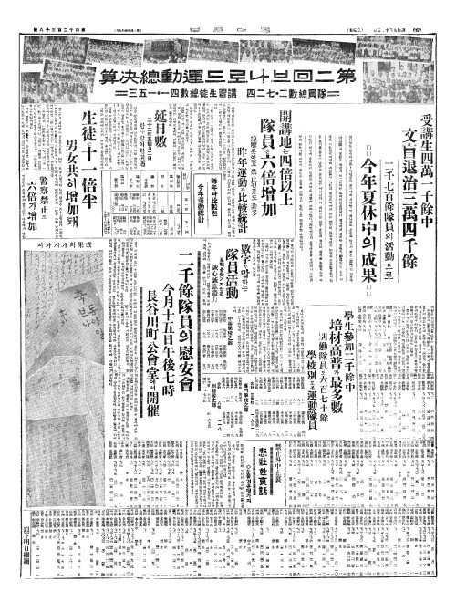 - 二千餘隊員(이천여대원)의慰安會(위안회) 今月十五日午後七時(금월십오일오후칠시) 長谷川町公會堂(장곡천정공회당)에서開催(개최)