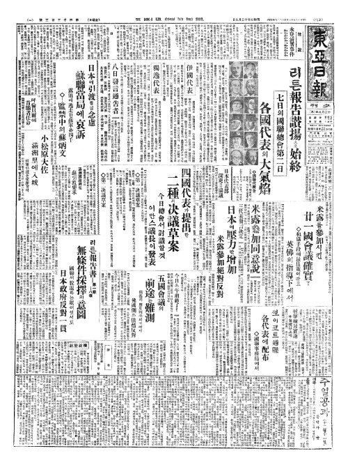- 리튼報吿讃揚(보고찬양)으로始終(시종) 七日(칠일)의國聯總會第二日(국련총회제이일) 各國代表(각국대표)의大氣焰(대기염)