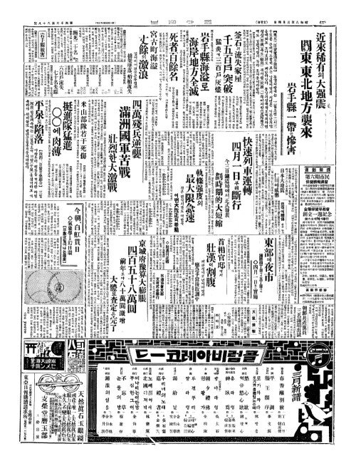 - 岩手縣海溢(암수현해일)로 海岸地方全滅(해안지방전멸)