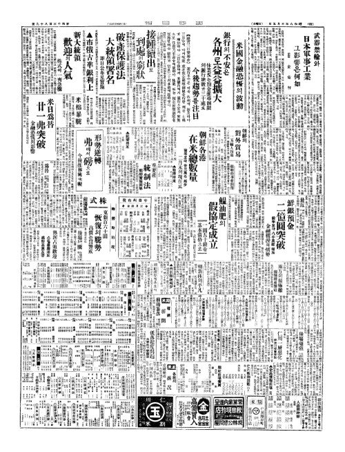 - 銀行(은행)의休業(휴업) 紐育(뉴육)에遂波及(수파급)
