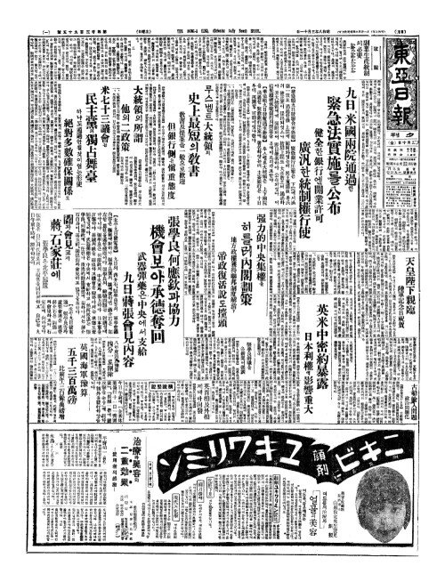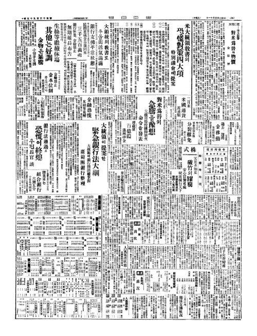 - 九日(구일)、米國兩院通過(미국량원통과)한 緊急法實施(긴급법실시)를公布(공포)