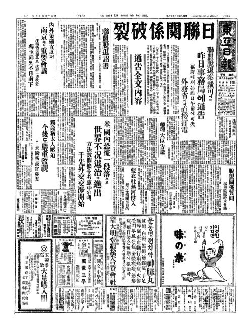 - 聯盟脫退通吿(련맹탈퇴통고) 廿七日正式發送(입칠일정식발송) 內田外相中外(내전외상중외)에聲明(성명)