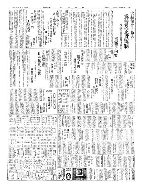 - 大統領令(대통령령)으로布吿(포고)된 爲替及正貨統制(위체급정화통제)