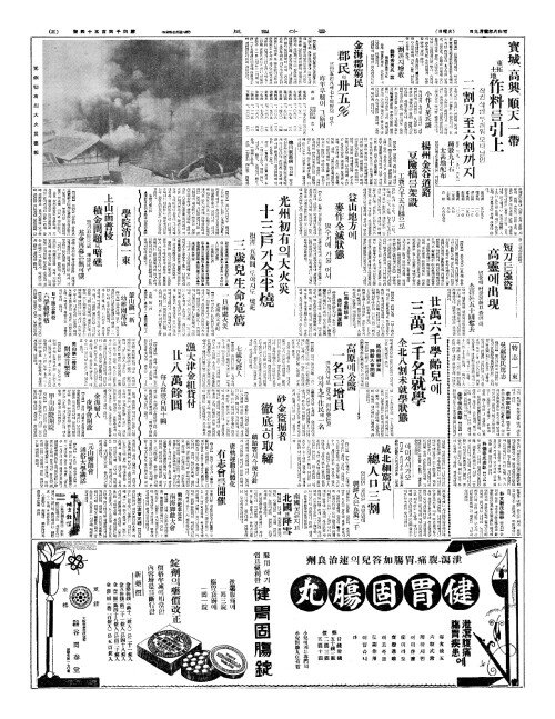- 光州初有(광주초유)의大火災(대화재) 十三戶(십삼호)가全半燒(전반소)