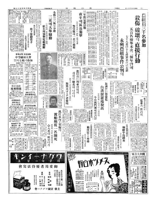 - 農組員三千名參加(농조원삼천명참가) 殺傷(살상)、破壞(파괴)의直接行動(직접행동)