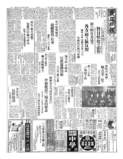- 對日軟化(대일연화)와影響(영향) 蔣(장)의對日妥協(대일타협)에 各方面(각방면)서猛反對(맹반대)