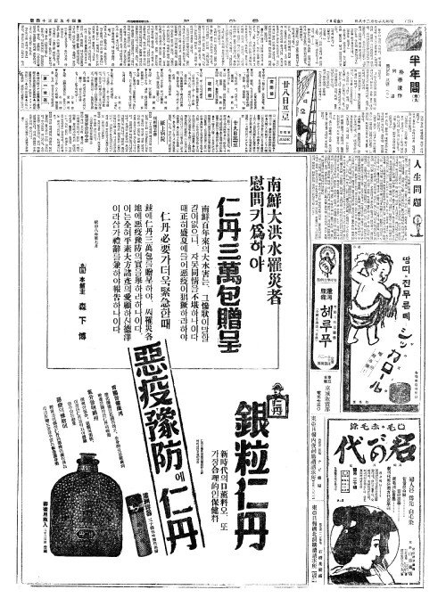 - 大阪仁丹舖主(대판인란포주) 災民(재민)에藥寄贈(약기증)