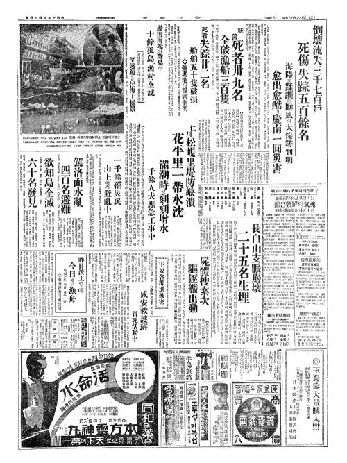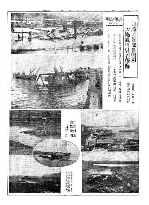 - 倒壞流失三千七百戶(도괴류실삼천칠백호) 死傷(사상)、失踪五百餘名(실종오백여명)