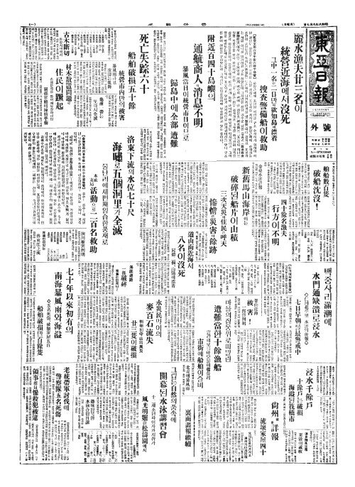 - 七十年以來初有(칠십년이내초유)의 南海暴風雨(남해폭풍우)와海溢(해일)