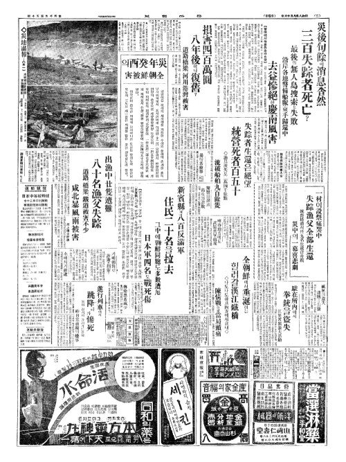 - 出漁中廿隻遭難(출어중입척조난) 八十名漁父失踪(팔십명어부실종)