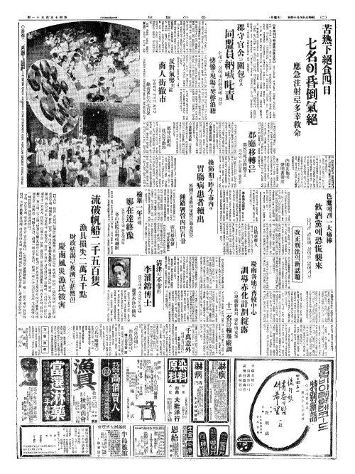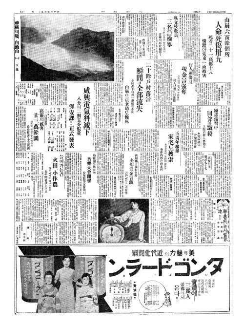 - 山崩六百餘個所(산붕륙백여개소) 人命死傷卅九(인명사상삽구)