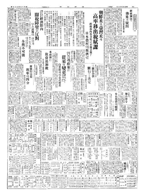 - 朝鮮米(조선미)와臺灣米(대만미)에 高率移出稅賦課(고솔이출세부과) 政府部內有力化(정부부내유력화)로不遠立案(부원입안)?