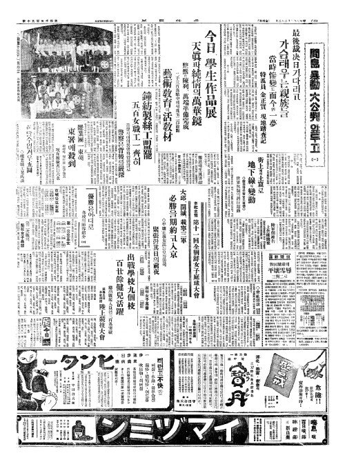 - 本社主催(본사주최) 第十一回全朝鮮女子庭球大會(제십일회전조선녀자정구대회) 大邱(대구)、開城(개성)、載寧三軍(재녕삼군) 必勝(필승)을期約(기약)코入京(입경)