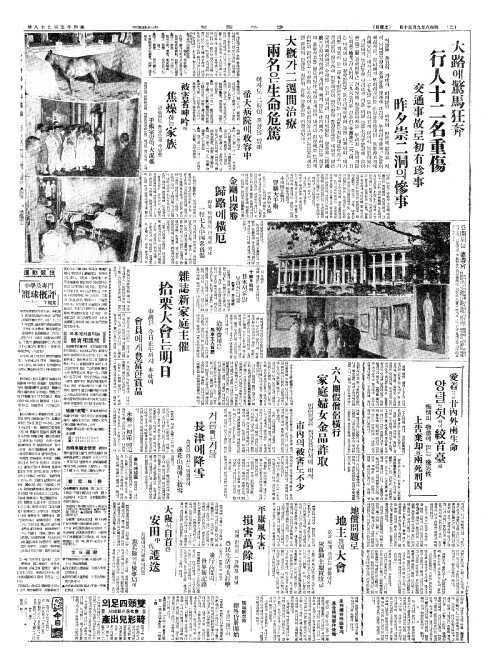 - 大路(대로)에驚馬狂奔(경마광분) 行人十二名重傷(행인십이명중상) 交通事故(교통사고)로初有珍事(초유진사) 昨夕崇二洞(작석숭이동)의慘事(참사)