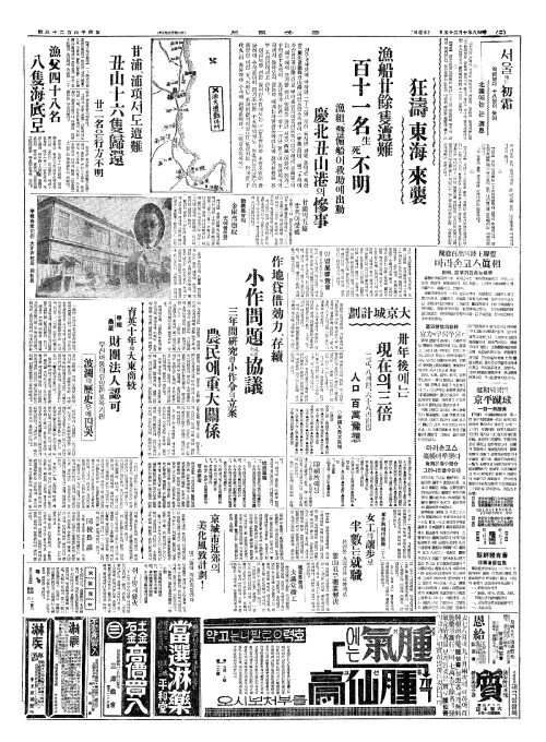 - 漁船八隻(어선팔척)이沈沒(침몰) 小學校等四棟倒壞(소학교등사동도괴)