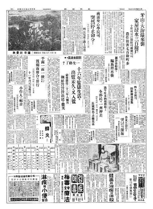 - 牙山(아산)에大海溢來襲(대해일내습) 家屋浸水三百餘戶(가옥침수삼백여호)