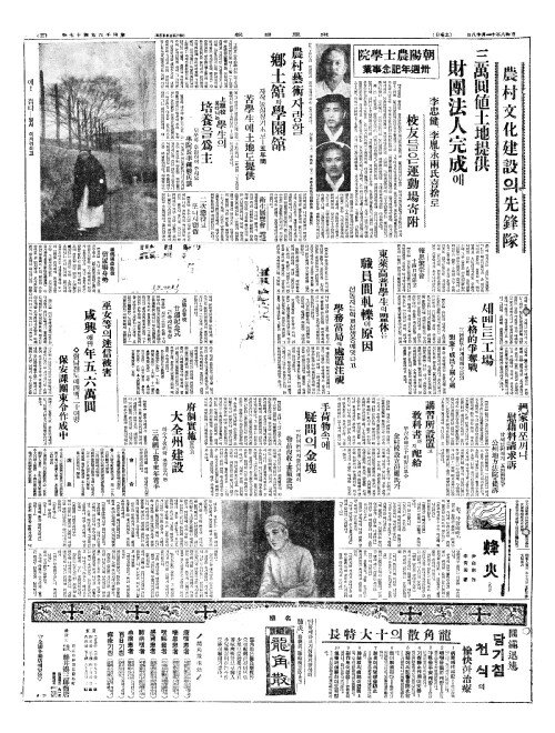 - 朝陽農士學院(조양농사학원) 卅週年記念事業(삽주년기념사업) 農村文化建設(농촌문화건설)의先鋒隊(선봉대) 三萬圓値土地提供(삼만원치토지제공) 財團法人完成(재단법인완성)에