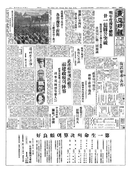 - 明年度豫算總額(명년탁예산총액) 廿一億圓(입일억원)을突破(돌파) 復活容認(복활용인)은不過五千萬圓(부과오천만원)?