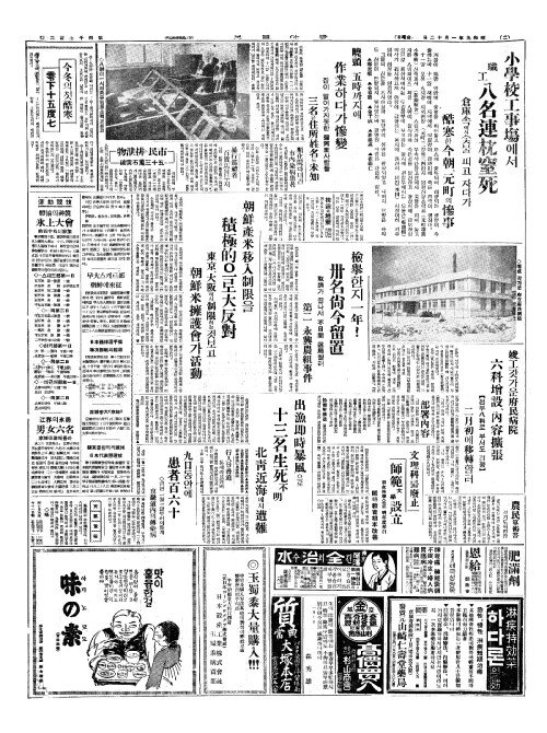 - 小學校工事塲(소학교공사장)에서 職工八名連枕窒死(직공팔명련침질사)